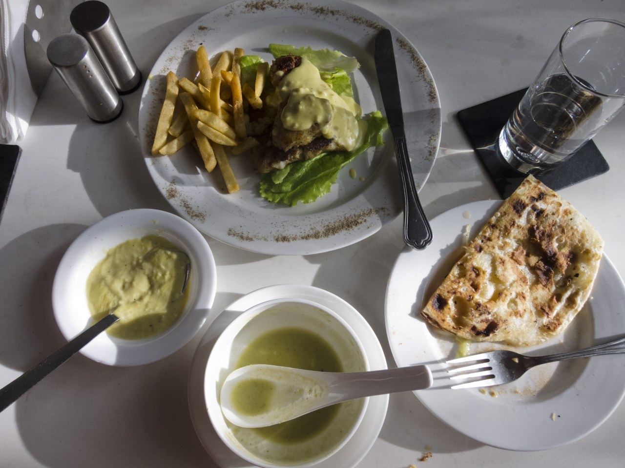 В перший день з незвички здавалося, що з рота ось-ось піде вогонь, але нас, напевно, вирішили пожаліти, бо на третій день обіди стали трохи більш «європейськими». Колега сказав, що в порівнянні з Амлою це ще прісна їжа. Так чи інакше, я потроху до неї звикаю, і всі побоювання щодо страшних вірусів і шлункових розладів поки що — тук-тук-тук! — виявилися безпідставними. Хоча воду з крану ні в якому разі не пийте (навіть у готелі) — тільки бутильована вода!